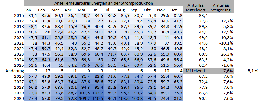 Während die Sommermonate einen steigenden Trend zeigen, bleiben die Wintermonate zurück. Dies wirkt sich auch stark auf die Trendprognose aus. Bereits im Jahr 2029 könnte der Anteil erneuerbarer Energien 100 % betragen, was jedoch nur für die Sommermonate realistisch erscheint.